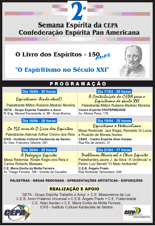 Organização: ICKS - Patrocínio: CE Allan Kardec, Ângelo Prado, Maria Emilia da Motta Ferreira, Fraternidade Espírita, Lar Veneranda e Missionários.
